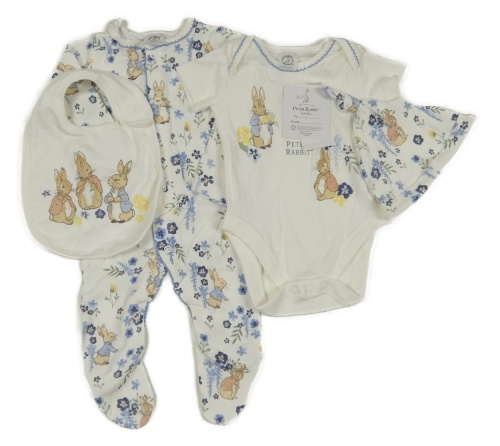 Nové - 4 set - modro bílo kvetované body s králíčkem Petrem + modrobílý overal +bryndák + čapica