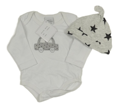 Nové - Biele body s autem + sivá čapica s hviezdami
