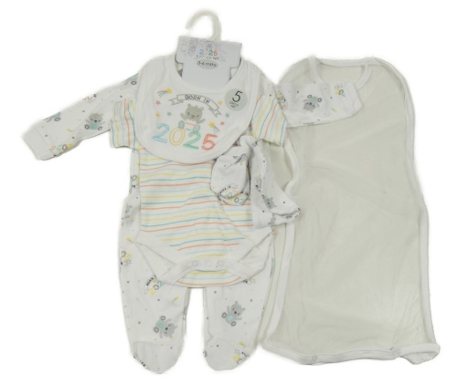 Nové - 5set - Bielo-farebné pruhované body + biely overal s medvědy + slinták + bavlněná čepice + rukavičky
