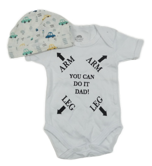 2set - Biele body s nápisem + smotanová čapica s autami