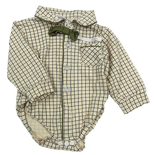 Béžovo-čierne kockované košeľové body s motýlkom