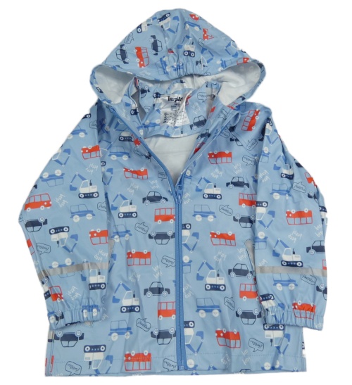 Svetlomodrá vodeodolná jesenná bunda s autami a nápismi a kapucňou Lupilu
