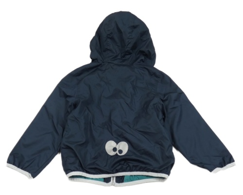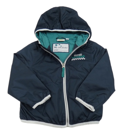 Tmavomodrá šušťáková jesenná bunda s nápisom a kapucňou Kids