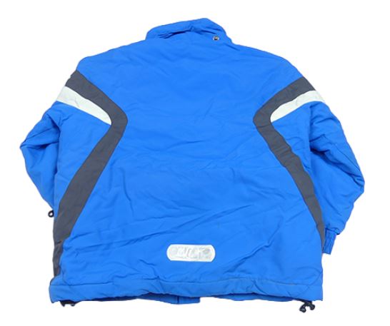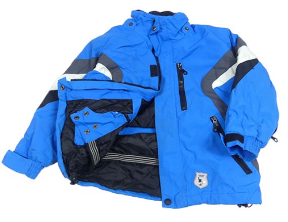 Modro-tmavošedo-bielo-čierna šušťáková zimná lyžiarska bunda s nášivkou