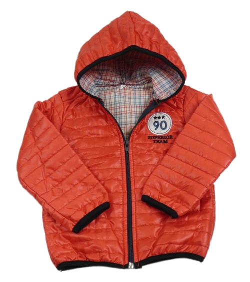 Červená šušťáková prešívaná ľahká zateplená bunda s nášivkou a kapucňou