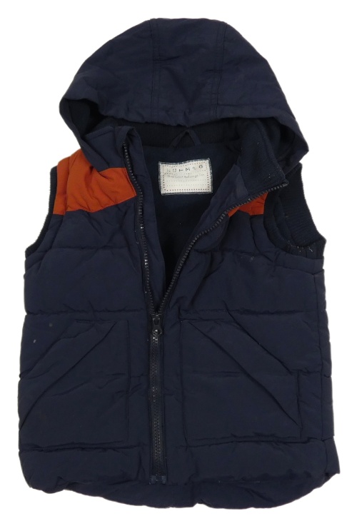 Tmavomodrá šušťáková zateplená vesta s hnedým pruhom a kapucňou Nutmeg