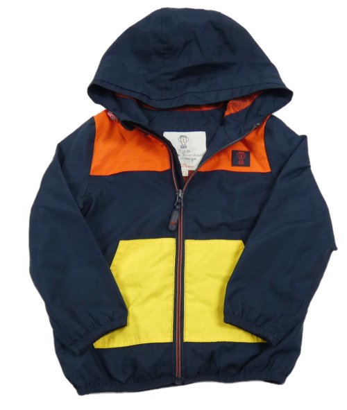 Tmavomodro-červeno-žltá šušťáková jarná bunda s kapucňou