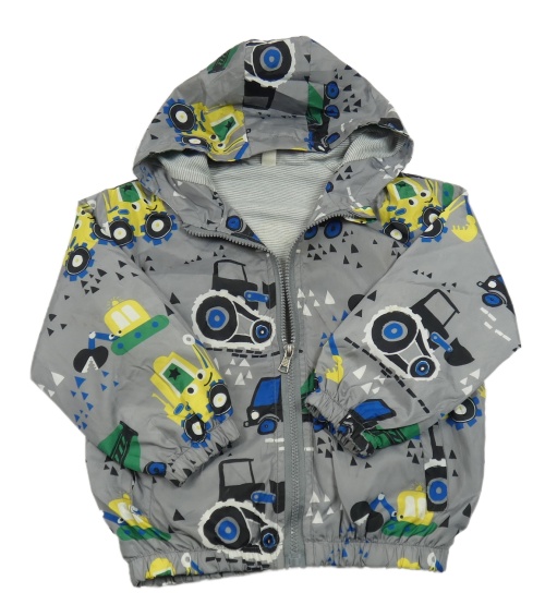 Sivá šušťáková jarná bunda s traktormi a kapucňou