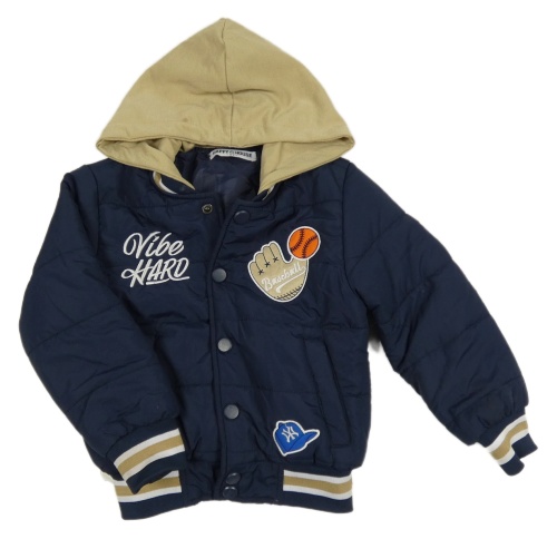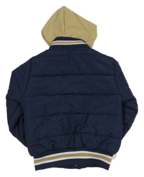 Tmavomodro-béžový šusťákový zateplený bomber s výšivkami a kapucňou