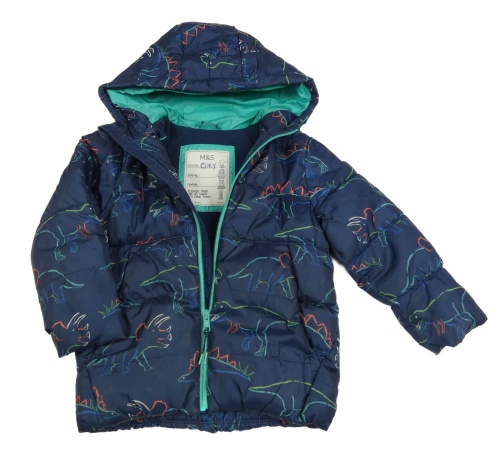 Tmavomodrá šušťáková zimná bunda s dinosaurami a kapucňou M&S