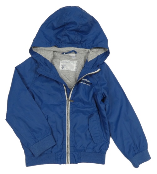 Tmavomodrý šusťákový jarní bomber s nápismi a kapucňou impidimpi