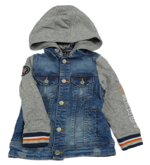 Modro-sivá rifľová bunda s teplákovymi rukávy a kapucňou C&A