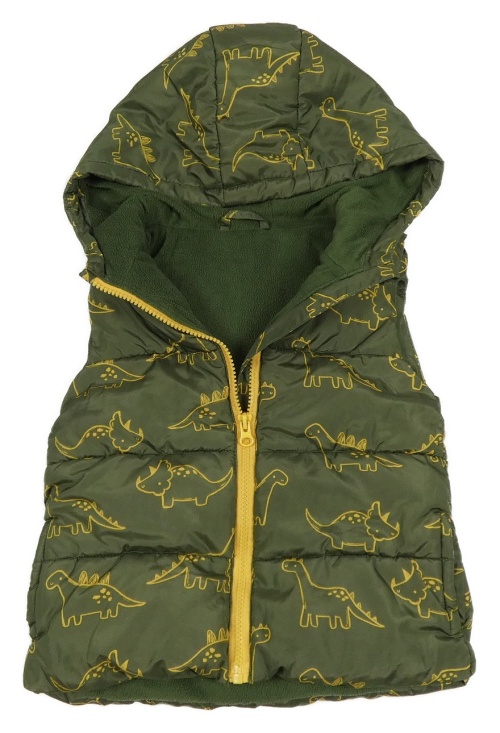 Khaki šušťáková zateplená vesta s dinosaurami a kapucňou