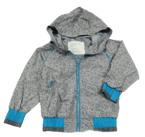 Svetlošedá -modrá šušťáková podšitá bunda s obrázkami a kapucňou