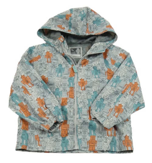 Sivo-oranžovo-zelená šušťáková jarná bunda s robotmi a kapucňou Tu