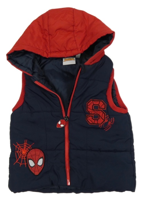 Tmavomodro-červená šušťáková zateplená vesta so Spideramenam a kapucňou Marvel