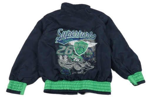 Tmavomodrá šušťáková jarná bunda s nápisom