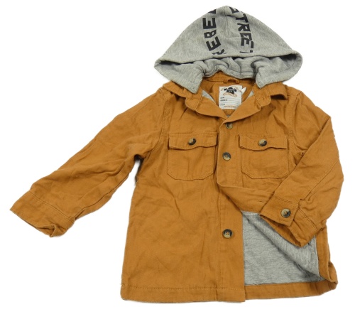 Okrovo-sivá podšitá košeľová bunda s teplákovou kapucňou a nápisom