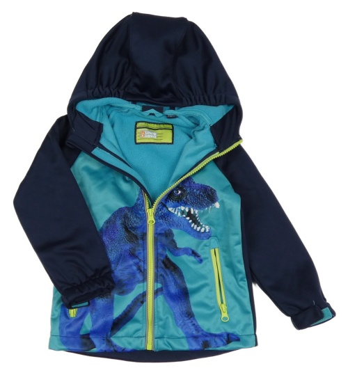 Modrozeleno-tmavomodrá softshellová bunda s dinosaurom a kapucňou impidimpi