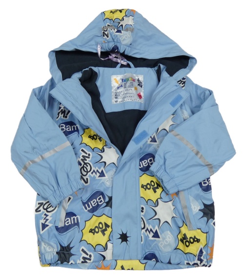 Svetlomodrá nepromokavá jarná bunda s nápismi a kapucňou lupilu