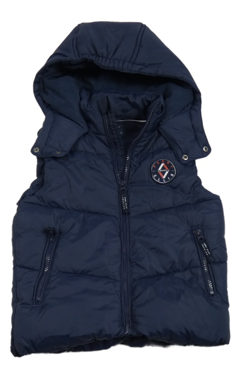 Tmavomodrá šušťáková zateplená vesta s nášivkou a kapucňou