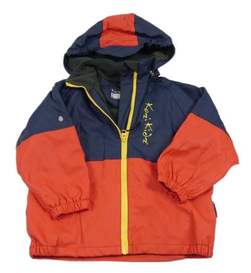 • Tmavomodro-červená nepromokavá jarná bunda s logom a odopínacíá kapucňou Kozi Kidz