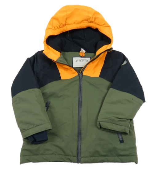 • Kaki-tmavomodro-oranžová šušťáková zimná lyžiarska bunda s nášivkou a kapucňou Topolino
