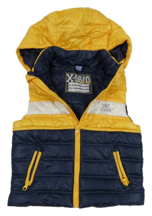 Tmavomodro-žlto-biela šušťáková zateplená vesta s nápisom a kapucňou Dopodopo