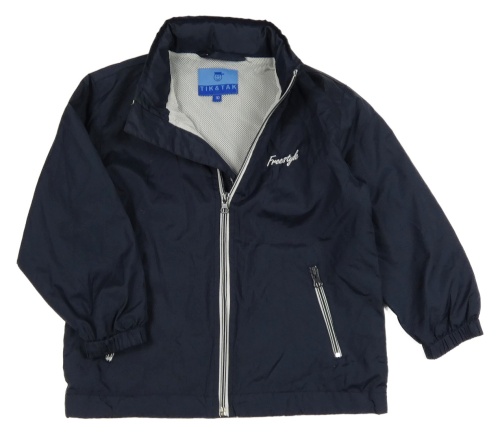 Tmavomodrá šušťáková jarná bunda s nápisom a ukrývací kapucňou