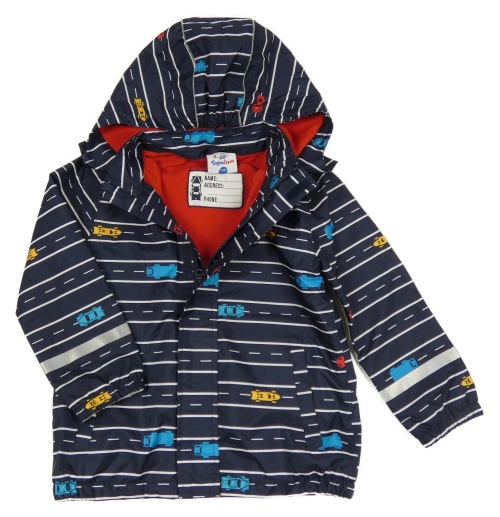 Tmavomodro-biela pruhovaná šušťáková jarná bunda s autami a kapucňou Topolino