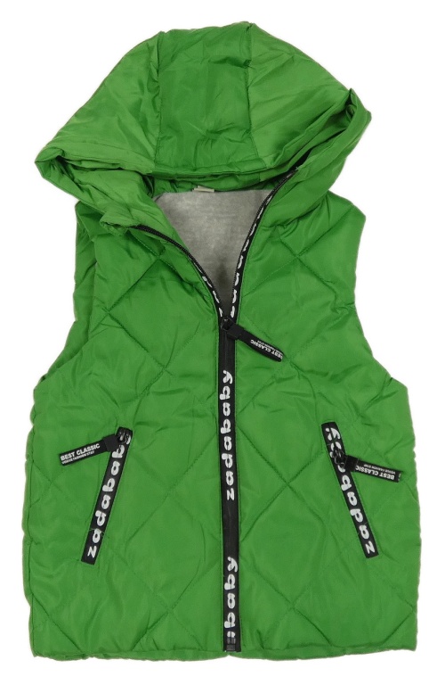 Zelená šušťáková zateplená vesta s nápismi a kapucňou