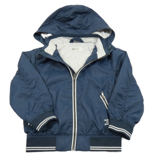 Tmavomodrý šusťákový jarní bomber s nápismi a pruhmi a odopínacíá kapucňou H&M