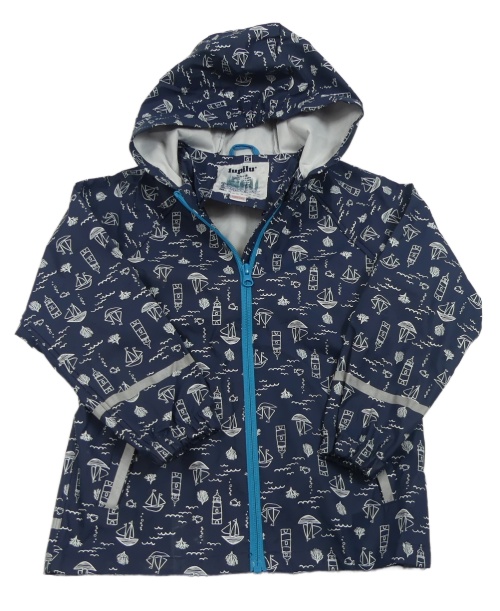 Tmavomodrá vzorovaná nepromokavá bunda s majáky a kapucňou Lupilu
