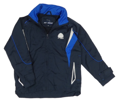 Tmavomodro-modrá šušťáková športová bunda s potlačou
