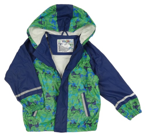 Zeleno-tmavomodrá nepromokavá jesenná bunda s autami a kapucňou Lupilu