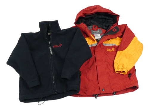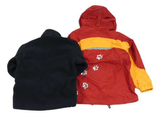 • 3v1 - červeno-žltá šušťáková celoroční bunda s logom a kapucí + tmavomodrá prepínaci fleecová mikina Jack Wolfskin