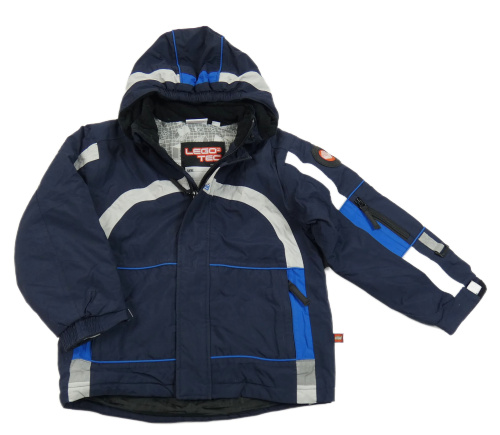 Tmavomodro-sivá šušťáková zimná lyžiarska bunda s pruhmi a kapucňou