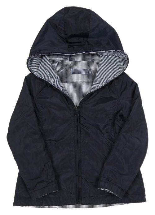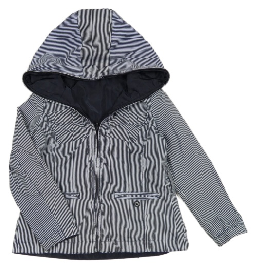Tmavomodro-biela pruhovaná šušťáková jarná obojstranná bunda s kapucňou