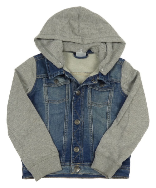 Tmavomodro-sivá rifľová bunda s teplákovymi rukávy a kapucňou Pocopiano