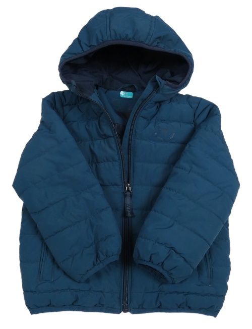 Tmavopetrolejová prešívaná šušťáková prechodná bunda s nápismi a kapucňou C&A