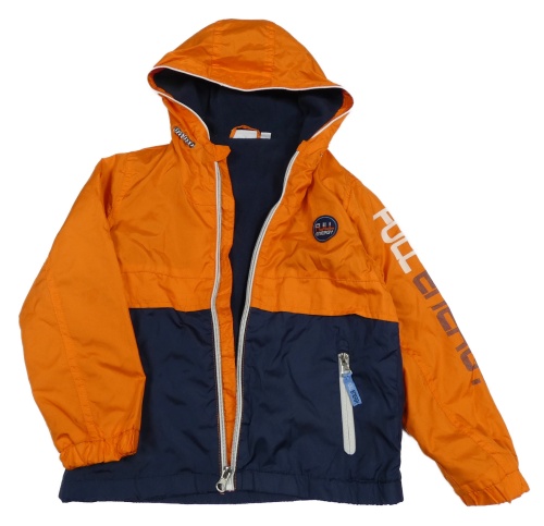 Oranžovo-tmavomodrá šušťáková lehce zateplená bunda s nápismi a kapucňou Kids