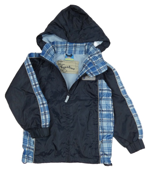 • Tmavomodro-modro/kostkovaná šušťáková jarná bunda s nášivkou a odopínacíá kapucňou Topolino