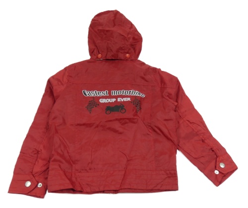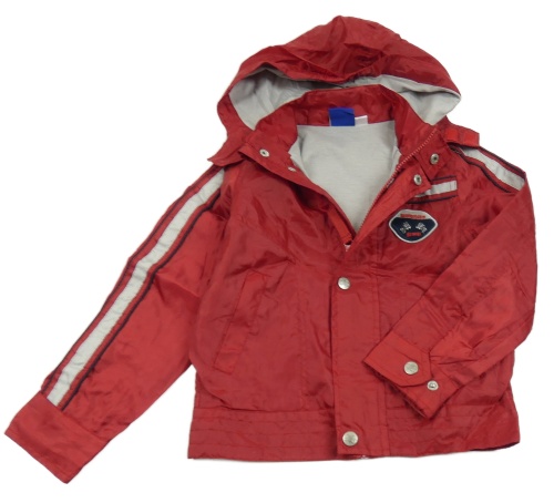 • Červená kockovaná šušťáková jarná bunda s nášivkou a pruhmi a odopínacíá kapucňou lupilu