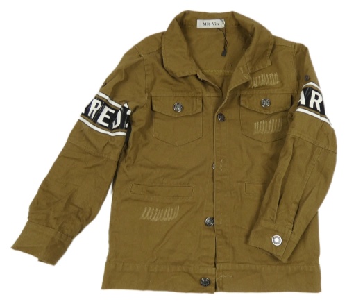 Hnedá rifľová košeľová bunda vyšúchaného vzhledu a nápisy a pruhmi Mr. Vin