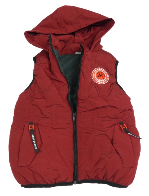 Červená šušťáková zateplená vesta s nášivkou a kapucňou