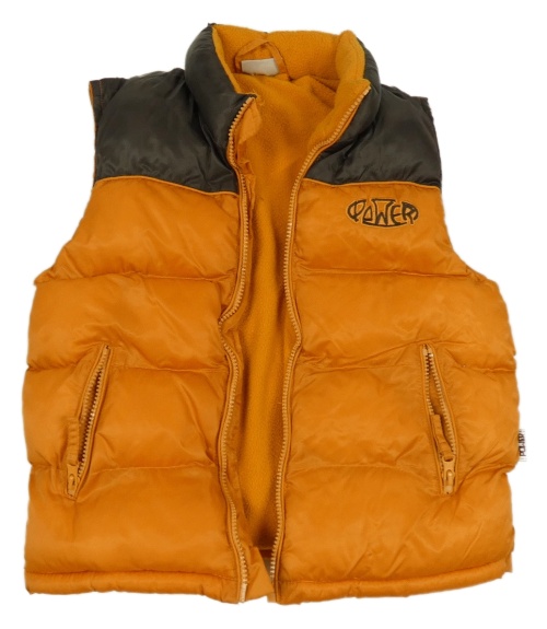 Oranžovo-hnedá šušťáková prešívaná zateplená vesta s nápisom
