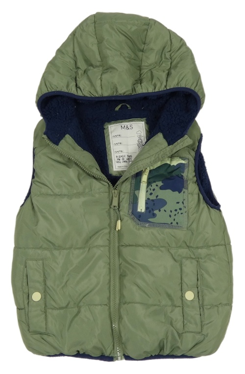 Khaki šušťáková zateplená vesta s army vreckom a kapucňou M&S