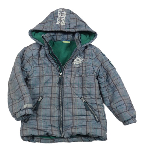 • Tmavomodro-bielo-hnedá kockovaná šušťáková zimná bunda s potlačou a kapucňou Topolino