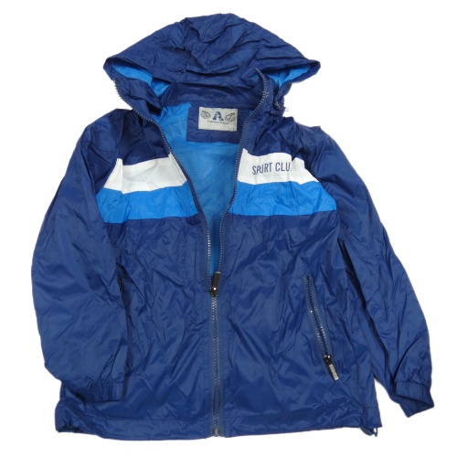 Tmavomodro-biela šušťáková jarná bunda s nápisom a kapucňou