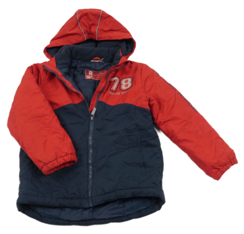 Tmavomodro-červená šušťáková zimná bunda s nápisom a kapucňou